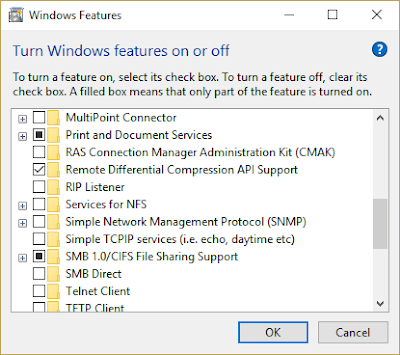 In the dialog that comes up, scroll down and find “SMB 1.0/CIFS File Sharing Support”.